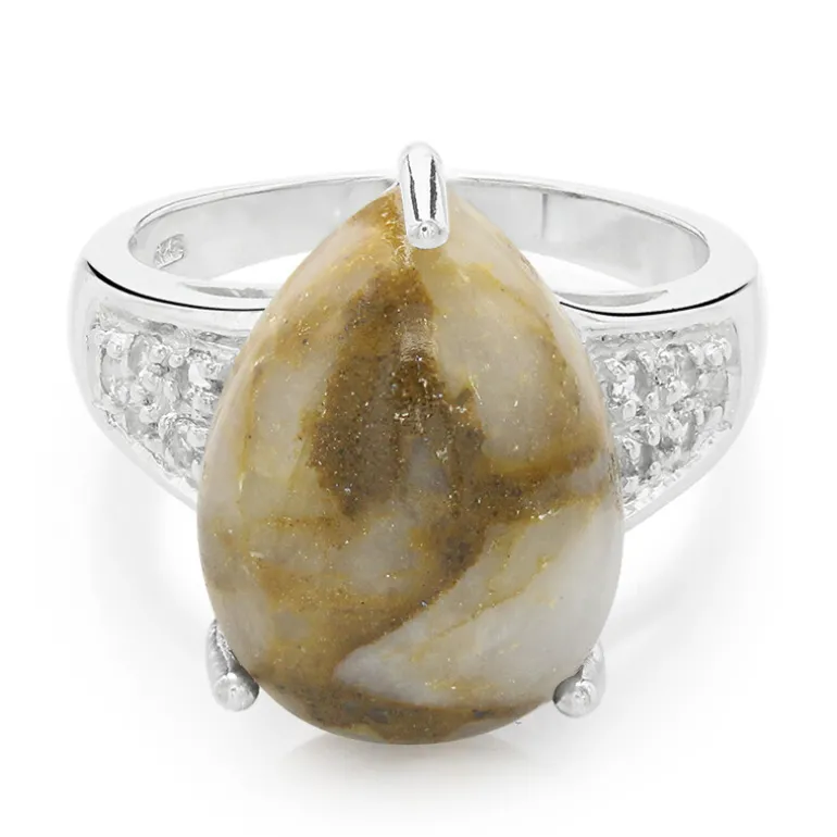Entdecken Sie die Faszination der Vergangenheit in diesem raffinierten Ring aus Sterlingsilber mit einem atemberaubenden Dinosaurierquarz von 7,78 Karat aus den USA. Dieser einzigartige tropfenförmige Cabochon-Edelstein wird von zehn funkelnden weißen Topasen aus Brasilien mit insgesamt 0,175 Karat akzentuiert. Das aus hochwertigem 925er Sterlingsilber gefertigte Schmuckstück wiegt etwa 4,15 Gramm. Sein unverwechselbares Design eignet sich perfekt, um sowohl der Freizeit- als auch der Gesellschaftskleidung einen Hauch von zeitlosem Charme zu verleihen, was es zu einer außergewöhnlichen Wahl für Sammler und Modebegeisterte gleichermaßen macht.