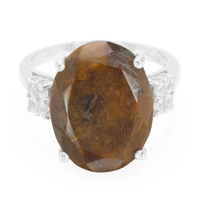 Dieser einzigartige Ring mit einem fesselnden 8,68-karätigen Dinosaurier-Quarz aus den USA im markanten Ovalschliff ist eine Reise in die Vergangenheit. Der große Quarz wird durch acht funkelnde weiße Topase von insgesamt 0,375 Karat aus Brasilien ergänzt, die sorgfältig gefasst wurden, um seine natürliche Schönheit zu unterstreichen. Der aus 925er Sterlingsilber gefertigte Ring lädt zu jeder Gelegenheit zu interessanten Gesprächen ein. Er eignet sich perfekt für alle, die einen Hauch von Geschichte zu schätzen wissen, und ist eine ausgezeichnete Wahl für zwanglose Ausflüge oder besondere Anlässe.