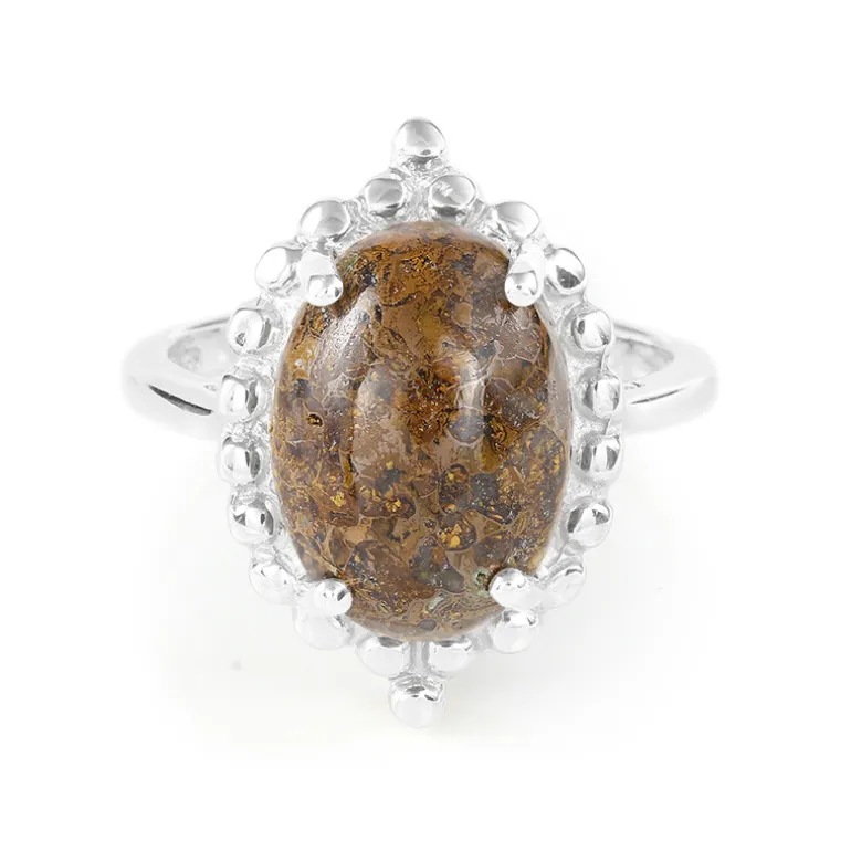 Erleben Sie ein Stück prähistorischer Anziehungskraft mit diesem faszinierenden Ring aus 925er Sterling Silber. Er zeigt einen einzigartigen 6,25 Karat Dinosaurier-Quarz aus den USA, der in einen glatten ovalen Cabochon geschliffen wurde, der elegant gefasst ist und die Blicke auf sich zieht. Das Silberband wiegt etwa 3,23 Gramm und bildet einen perfekten Kontrapunkt zu den warmen, erdigen Tönen des Quarzes. Dieses Schmuckstück ist ideal für Geschichtsinteressierte und Stilliebhaber und sorgt für Gesprächsstoff in jedem Outfit. Es eignet sich perfekt für zwanglose Zusammenkünfte oder elegante Abendveranstaltungen und ist eine vielseitige Ergänzung Ihrer Schmucksammlung.