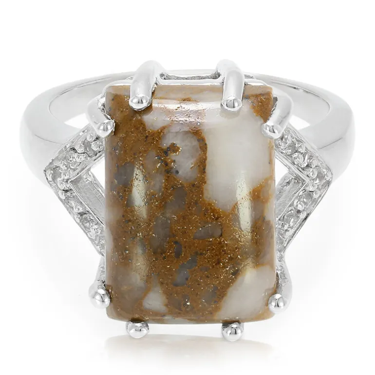 Entdecken Sie eine einzigartige Mischung aus Geschichte und Eleganz mit diesem Dinosaurier-Quarzring aus Sterlingsilber. Mit einem 6,79-karätigen Baguette-Cabochon aus den USA, ergänzt durch 0,08-karätige weiße Topas-Akzente, fängt dieses Stück die uralte Schönheit der Erde ein. Er eignet sich sowohl für zwanglose Ausflüge als auch für formelle Anlässe und lässt sich mühelos mit erdfarbenen Outfits kombinieren, um seine natürliche Ausstrahlung zu unterstreichen.