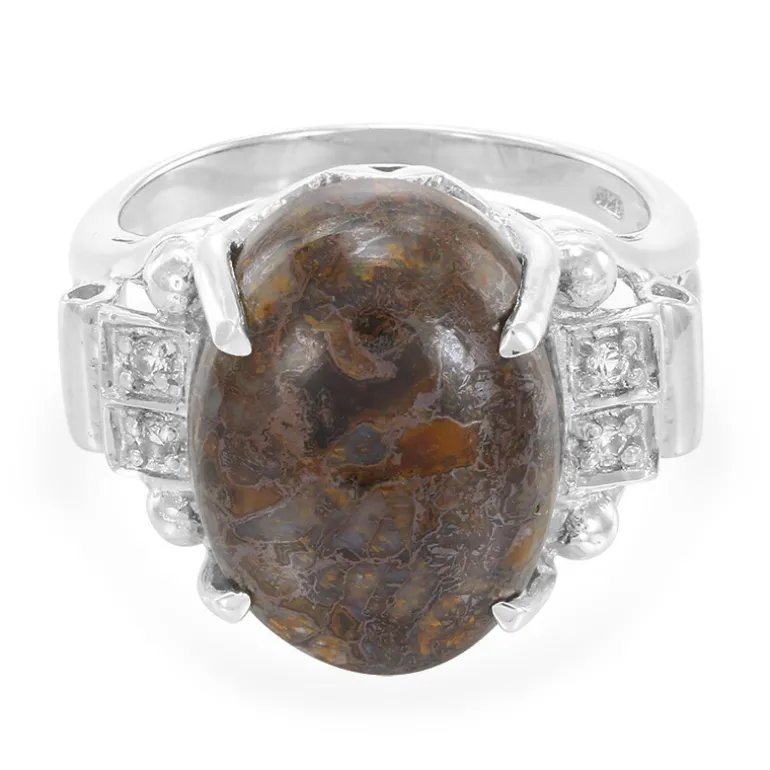 Mit diesem fesselnden Dinosaurier-Quarz-Silberring machen Sie einen Schritt zurück in die Vergangenheit. Mit einem beeindruckenden ovalen Cabochon aus Dinosaurier-Quarz von 9,45 Karat, eingefasst in 925er Sterlingsilber, erinnert dieses Schmuckstück an Geschichten aus einer längst vergangenen Zeit. Flankiert von vier brillanten brasilianischen Weißtopasen verleiht er ein Funkeln, das an die Sterne erinnert. Er ist ein ideales Accessoire für Geschichts- und Edelsteinliebhaber und wird bei jeder Veranstaltung für Gesprächsstoff sorgen. Kombinieren Sie ihn mit Ihrer Lieblingsabendgarderobe und lassen Sie seinen geheimnisvollen Charme erstrahlen.