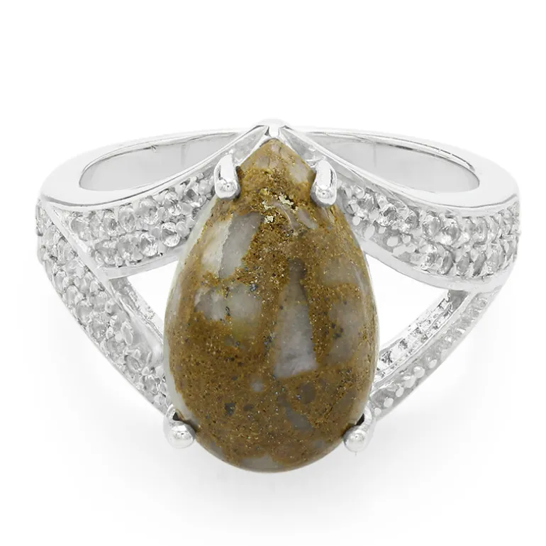 Dieser atemberaubende Ring mit einem tropfenförmigen Dinosaurier-Quarz-Cabochon von 4,37 Karat als Herzstück fängt die Essenz prähistorischer Schönheit ein. Eingebettet in ein 925er Sterlingsilberband, wird dieser einzigartige Edelstein aus den USA von 47 glitzernden weißen Topasen aus Brasilien ergänzt, die das Band in strahlendes Licht hüllen. Dieser Ring passt sowohl zu legeren als auch zu raffinierten Styles und verleiht jedem Outfit einen Hauch von antiker Anziehungskraft.