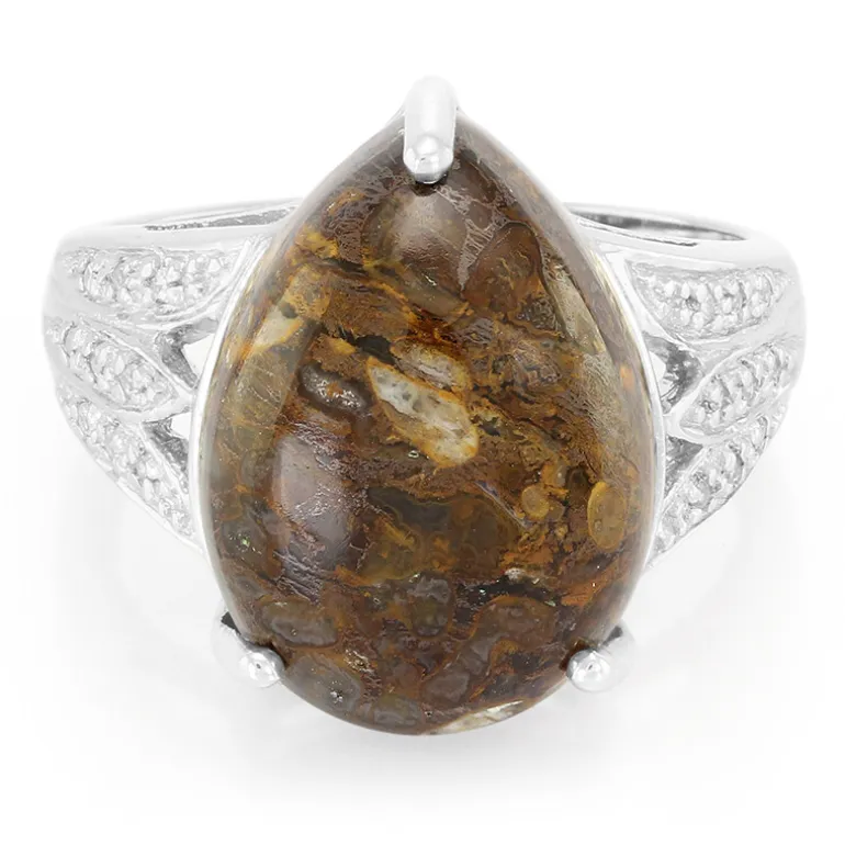 Erleben Sie den Zauber prähistorischer Anziehungskraft mit diesem raffinierten Ring mit einem faszinierenden 9,9-karätigen Dinosaurierquarz aus den USA, der elegant in 925er Sterlingsilber eingefasst ist. Der tropfenförmige Cabochon-Schliff hebt die natürlichen Muster des Steins hervor und erinnert an die Essenz einer antiken Welt. Umgeben von funkelnden kambodschanischen Zirkon-Highlights von insgesamt 0,129 ct, ist dieses 34×25 mm große Stück ein Zeugnis zeitloser Schönheit. Es eignet sich perfekt, um ein Statement zur Berufskleidung abzugeben oder die Abendgarderobe aufzuwerten und ist ein einzigartiger Gesprächsanlass für Sammler und Modefans gleichermaßen.