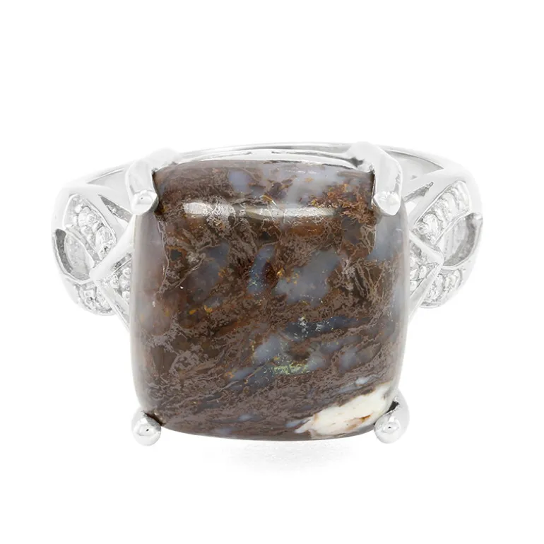 Machen Sie einen Schritt zurück in die Vergangenheit mit diesem fesselnden USA Dinosaurier Quarz Silberring, der mit einem 11,46ct antiken Kissen-Cabochon in der Mitte ausgestattet ist, der Geschichten aus einer vergangenen Ära erzählt. Umgeben von glitzernden kambodschanischen Zirkon-Akzenten von insgesamt 0,129ct, wiegt dieses Stück aus 925er Sterlingsilber ungefähr 3,53g. Der 34×25 mm große Ring besticht durch seine einzigartigen, milchigen Wirbel und seinen historischen Charme, der jedem Outfit einen Hauch von Faszination verleiht. Dieses Schmuckstück ist für Sammler und modebewusste Menschen gleichermaßen geeignet, um bei gesellschaftlichen Anlässen Eindruck zu schinden oder um bei kulturellen Veranstaltungen für Gesprächsstoff zu sorgen.