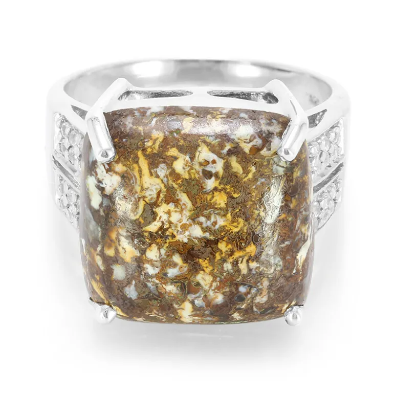 Erleben Sie die Anziehungskraft des Prähistorischen mit diesem fesselnden Silberring aus Dinosaurierquarz, der mit funkelnden Zirkonen verziert ist. Der Hauptstein hat einen antiken Kissen-Cabochon-Schliff, der ein faszinierendes Muster zeigt, das an die alte Erde erinnert. Mit einem Gewicht von über 12 Karat und umrahmt von 24 strahlenden kambodschanischen Zirkonen ist dieses Stück aus 925er Sterlingsilber ein Zeugnis von Handwerkskunst und Geschichte. Er eignet sich perfekt als Statement-Stück und passt sowohl zu legerer als auch zu gehobener Kleidung und vermittelt ein Gefühl der Zeitlosigkeit und des Staunens.