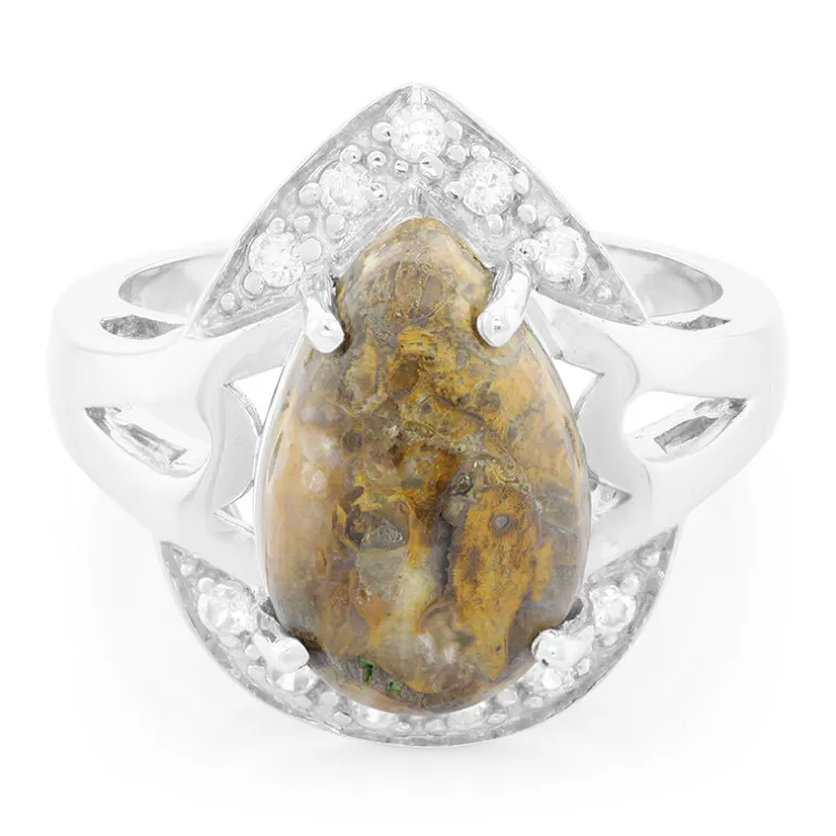 Entdecken Sie die prähistorische Anziehungskraft unseres Sterling-Silberrings mit einem prächtigen Dinosaurier-Quarz von 6,41 Karat aus den USA in einem tropfenförmigen Cabochon-Schliff, der von schimmernden Zirkon-Akzenten aus Kambodscha umhüllt wird. Das einzigartige Muster im Inneren des Quarzes erinnert an uralte Erde und wird durch den funkelnden 0,408 ct Zirkon im Brillantrundschliff ergänzt, was dieses Stück zu einem Gesprächsanlass und einer geschmackvollen Ergänzung jeder Schmucksammlung macht. Kombinieren Sie es mit erdigen Tönen oder einem schlichten schwarzen Outfit für einen exquisiten Hauch von naturinspirierter Eleganz bei Ihrem nächsten Event.