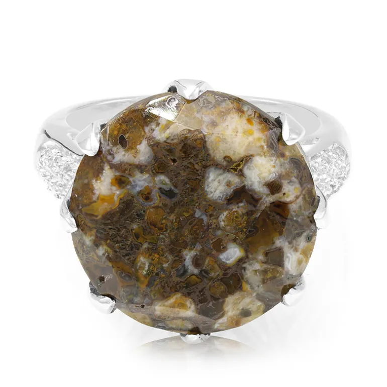 Entdecken Sie die uralte Schönheit dieses Schmuckstücks mit einem markanten Dinosaurierquarz von 10,63 Karat, der aus den USA stammt und auf etwa 16 mm abgerundet ist. Der einzigartige Edelstein wird von zwölf funkelnden weißen Topasen aus Brasilien flankiert, die alle sorgfältig geschliffen wurden, um ihre Brillanz zu unterstreichen. Eingefasst in ca. 4,17 Gramm hochwertiges 925er Sterlingsilber, verbindet dieser Ring historische Intrigen mit moderner Eleganz. Er eignet sich perfekt, um Ihrer Sammlung einen Hauch prähistorischen Charmes zu verleihen und ist ein auffälliges Accessoire sowohl für zwanglose Ausflüge als auch für besondere Anlässe.