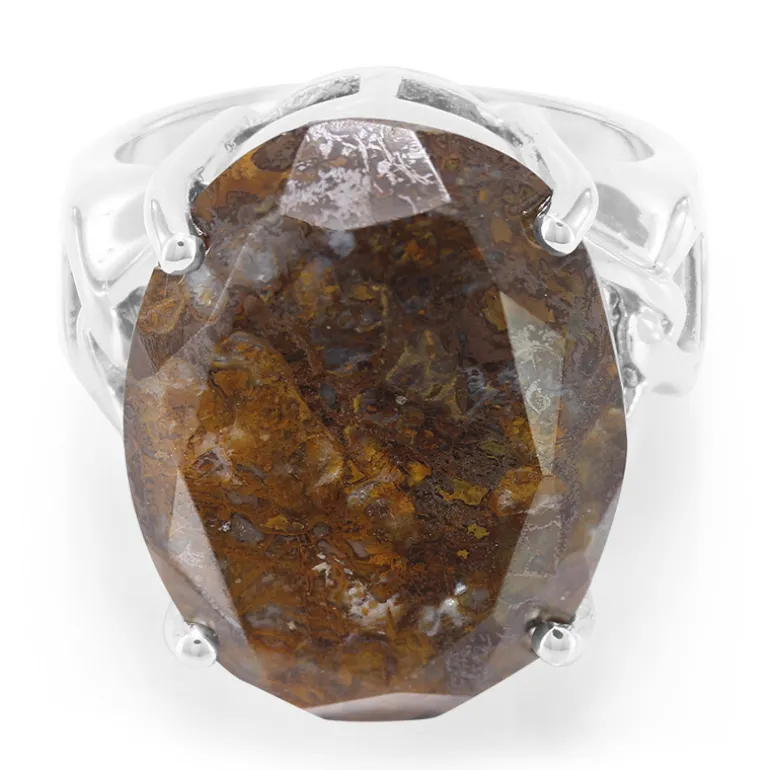 Mit diesem Ring aus Sterlingsilber mit Dinosaurier-Quarz entdecken Sie ein Stück alte Geschichte. Der 18,62ct große Edelstein im Ovalschliff aus den USA strahlt mit seinen erdigen Tönen eine gewisse Mystik aus. Dieser Ring passt sowohl zu legeren als auch zu raffinierten Ensembles und verleiht jedem Anlass eine einzigartige Note. Kombinieren Sie ihn mit neutralen oder kräftigen Farbtönen, um seine filigranen Muster und seine beeindruckende Größe zu betonen.