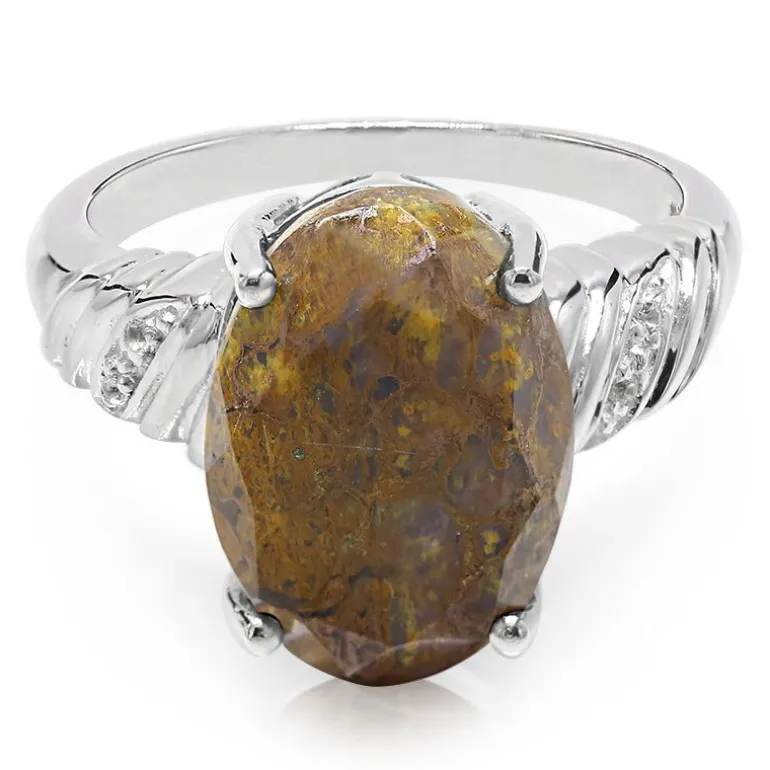Dieser bezaubernde Ring zeigt die seltene Schönheit des Dinosaurierquarzes, der in den USA ausgegraben wurde und 5,32 Karat wiegt. Der ovale Schliff des Steins zeigt erdige Töne und natürliche Muster, die an eine vergangene Ära erinnern. Ergänzt wird er durch vier brasilianische Weißtopase, die in der Sterlingsilberfassung funkeln. Mit einem Gewicht von ca. 3,06 Gramm eignet sich dieses Schmuckstück für alle, die geologische Wunderwerke oder historische Schätze zu schätzen wissen. Dieser Ring könnte ein Highlight bei einer Vernissage sein oder eine elegante Ergänzung zu Ihrem Alltagsoutfit.