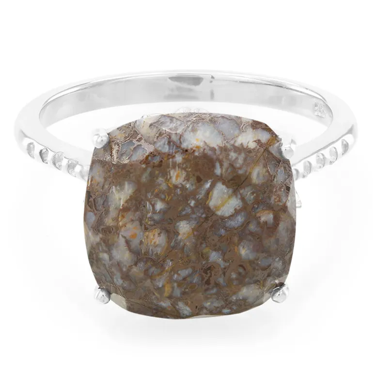 Dieser fesselnde Ring präsentiert einen atemberaubenden antiken Dinosaurierquarz im Kissenschliff mit 5,92 Karat, der aus den USA stammt und elegant in glänzendes 925er Sterling Silber gefasst ist. Flankiert von einer Konstellation aus 10 weißen Topasen aus Brasilien mit einem Gesamtgewicht von 0,069 ct, strahlt das Design zeitlosen Charme aus. Die einzigartige Textur des Edelsteins erinnert an antike Schönheit und sorgt für Gesprächsstoff bei jeder Gelegenheit. Er ist ein vielseitiges Schmuckstück, das sowohl zu legeren als auch zu formellen Outfits passt und ideal ist, um Ihrem Ensemble einen Hauch von Faszination zu verleihen.