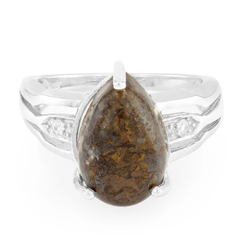 Machen Sie einen Schritt zurück in die Vergangenheit mit diesem fesselnden Ring aus US-Dinosaurier-Quarz mit einem glänzenden, tropfenförmigen Cabochon von 6,33 Karat in der Mitte, flankiert von zwei funkelnden Zirkonen aus Kambodscha. Der Ring ist in hochwertiges 925er Sterling Silber gefasst und sorgt für Gesprächsstoff bei Sammlern und Modebegeisterten gleichermaßen. Seine geheimnisvollen Muster erinnern an die Majestät der Antike und machen ihn zu einem idealen Accessoire für legere und formelle Kleidung sowie zu einem durchdachten Geschenk für alle, die das Wunder der Naturgeschichte zu schätzen wissen.