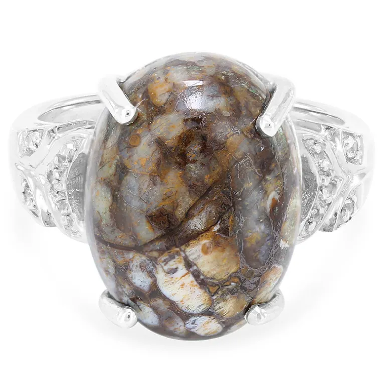 Entdecken Sie die Mystik der alten Welt mit unserem prähistorischen Quarz-Silberring. Dieses einzigartige Stück verfügt über einen ovalen Cabochon in der Mitte, der die natürliche Schönheit von 8,48ct Dinosaurier-Quarz aus den USA präsentiert. Umgeben von zehn funkelnden weißen Topasen mit einem Gesamtgewicht von 0,053 ct. wird das Design durch den Glanz von 925er Sterlingsilber mit einem Gewicht von ca. 3,67 g abgerundet. Der Ring hat eine Größe von 29 x 21 mm und ist ein Blickfang für jede Gelegenheit. Er ist perfekt für alle, die den Reiz der Geschichte und der Natur in einem exquisiten Schmuckstück zu schätzen wissen und passt sowohl zu legerer als auch zu formeller Kleidung.