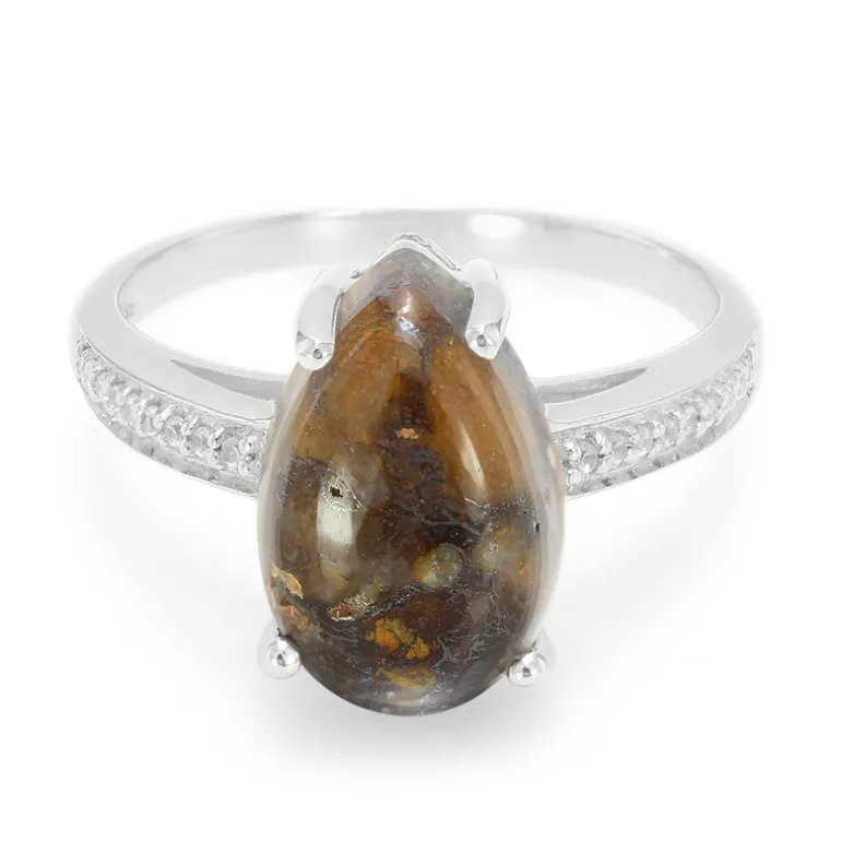 Entdecken Sie den prähistorischen Charme dieses fesselnden Dinosaurierquarz-Rings. Der tropfenförmige Cabochon von 4,98 Karat ist ein Naturphänomen, das in seinen einzigartigen Mustern die Essenz der Urzeit verkörpert. Verziert mit 18 funkelnden Zirkonen aus Kambodscha von insgesamt 0,131 ct. vereint dieser Ring aus 925er Sterlingsilber mit einem Gewicht von 2,6 g moderne Eleganz und historischen Charme. Perfekt, um ein Statement zur Arbeitskleidung oder eine unerwartete Wendung zur Abendgarderobe zu setzen, verspricht dieser Ring, Gespräche und Bewunderung auszulösen.