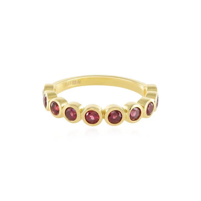 Entdecken Sie die Anziehungskraft dieses faszinierenden Rings mit zehn tiefroten Spinellen im Rundschliff, die wunderschön in glänzendes 925er Sterlingsilber mit einer satten Goldplattierung gefasst sind. Jeder Spinell, der aus den üppigen Landschaften Myanmars stammt, hat ein Gesamtkaratgewicht von 0,869. Das schlichte und doch atemberaubende Design verleiht ihm einen Hauch von Raffinesse und macht ihn zu einem idealen Accessoire sowohl für zwanglose Brunches als auch für elegante Abendveranstaltungen. Lassen Sie sich von der luxuriösen Wärme dieses Rings verzaubern, der Ihre Hand mit seinem subtilen Charme und seiner leuchtenden Farbe verschönert.