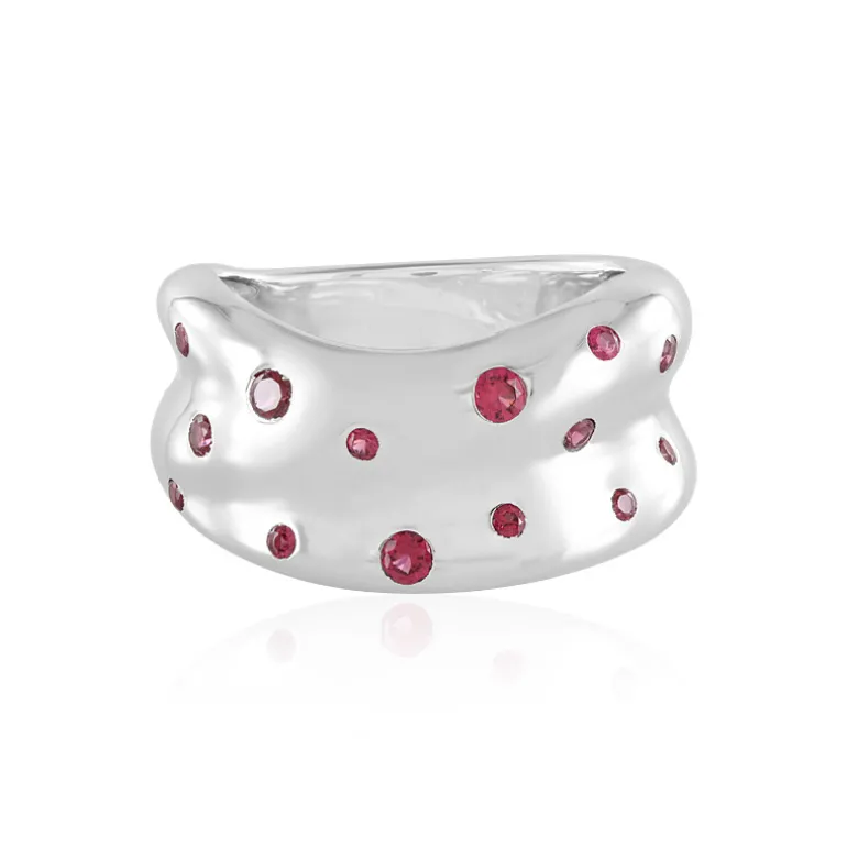 Verzaubern Sie Ihr Ensemble mit diesem faszinierenden Ring aus Sterlingsilber, der mit einem Cluster aus 14 strahlend roten Spinellen aus dem Herzen Tansanias mit einem Gesamtgewicht von 0,441 ct geschmückt ist. Der fachmännisch mit einem skurrilen, sporadischen Muster gearbeitete Ring hat ein kühnes Design von 22 x 23 mm, das bei jeder Geste ins Auge fällt. Die Edelsteine im Rundschliff sorgen für ein luxuriöses Funkeln und machen den Ring zu einem idealen Accessoire für Abendveranstaltungen oder zu einem raffinierten Statement-Stück für den täglichen Gebrauch. Kombinieren Sie ihn mit Ihrem Lieblingscocktailkleid oder werten Sie ein legeres Outfit mit diesem bezaubernden Hauch von Eleganz auf.