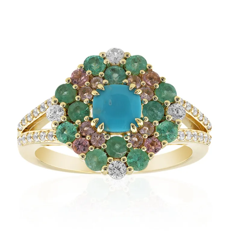 Entdecken Sie die Eleganz dieses fesselnden Goldrings mit einem atemberaubenden Türkis in der Mitte, der von leuchtenden russischen Smaragden und zarten rosa Turmalinen akzentuiert wird. Der Ring ist in 9 Karat Gelbgold gefasst und wird durch funkelnde kambodschanische Zirkone im antiken Kissenschliff bereichert. Dieser Ring eignet sich perfekt für eine Abendgala oder verleiht jedem Outfit einen Hauch von Raffinesse und ist ein Statement von zeitloser Schönheit.