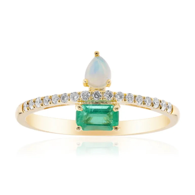 Dieser exquisite Ring zeigt einen atemberaubenden AAA-Smaragd aus Sambia im Oktagon-Schliff, gepaart mit einem bezaubernden Welo-Opal aus Äthiopien, beide gefasst in luxuriösem 14K-Gelbgold. Mit 17 Diamanten im Brillantschliff SI2 strahlt dieses Schmuckstück Eleganz und Charme aus. Er eignet sich perfekt für anspruchsvolle Anlässe oder als luxuriöses Accessoire für den Alltag und passt sowohl zu Abendkleidern als auch zu eleganten Outfits.