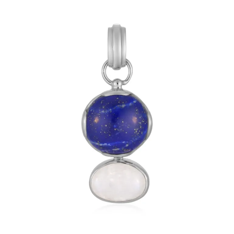 Dieser Anhänger aus Sterlingsilber, der für zusätzlichen Glanz plattiert wurde, besticht durch seine himmlische Kombination aus einem runden afghanischen Lapislazuli-Cabochon (13 Karat) oben und einem ovalen Bihar-Regenbogen-Mondstein (5,5 Karat) aus Indien unten. Zusammen bilden sie ein 18-karätiges himmlisches Ensemble mit leuchtenden blauen und ätherischen weißen Farbtönen, die den Nachthimmel widerspiegeln. Perfekt, um den Alltag zu verschönern oder der Abendgarderobe den letzten Schliff zu geben.