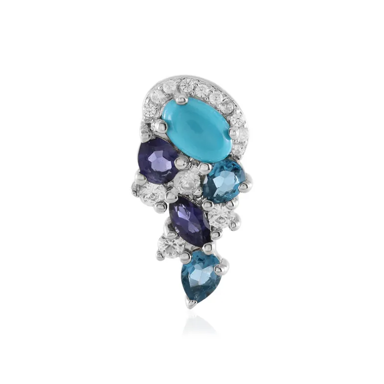 Dieser Anhänger besticht durch seinen leuchtenden Dornröschen-Türkis aus den USA, der von einer Reihe von Iolithen aus Madagaskar und Londoner Blautopasen aus Brasilien ergänzt wird. Der ovale Cabochon, der Marquise- und der Tropfenschliff bilden eine visuelle Harmonie, eingebettet in platiniertes 925er Sterling Silber. Mit einem Gewicht von 1,39 g ist dieser Anhänger ein leichter Akzent für jedes Outfit und eignet sich besonders für elegante Abendveranstaltungen oder als Blickfang für den Tag. Das Gesamtgewicht der Edelsteine von 1,193 ct sorgt für ein raffiniertes Strahlen. Fügen Sie ihn Ihrer Sammlung hinzu und verleihen Sie ihr einen Hauch von Farbe und Anmut.