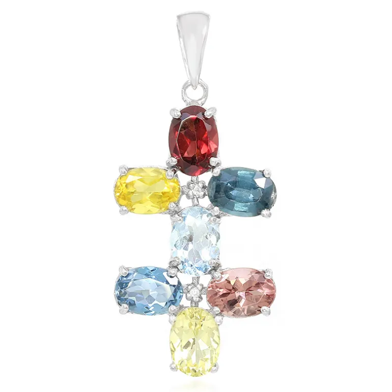 Entdecken Sie die Schönheit dieses Anhängers aus Sterlingsilber, der mit einer Vielzahl von Edelsteinen verziert ist. Almandin, Petrol-Kyanit, gelber Beryll, Santa-Maria-Aquamarin und Zirkon sind in eleganten Ovalen geschliffen und fangen das Licht ein. Dieses 5,123-Karat-Meisterwerk ist perfekt für jede Gelegenheit. Tragen Sie es, um der Alltagskleidung einen Farbtupfer zu verleihen oder ein Abendensemble zu ergänzen.