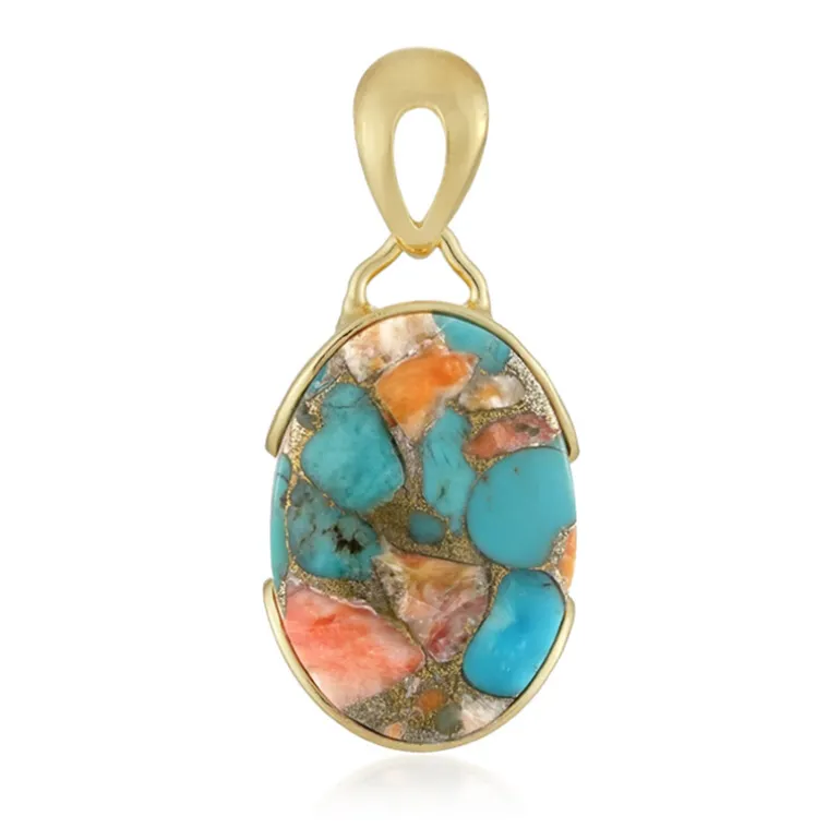 Entdecken Sie den atemberaubenden Kingman-Türkis-Silberanhänger mit einem faszinierenden Mosaik aus blauem Kingman-Mohave-Türkis und leuchtend orangefarbener, stacheliger Austernschale. Dieses exquisite Schmuckstück ist perfekt, um jedem Outfit einen Farbakzent zu verleihen und eignet sich sowohl für legere als auch für elegante Anlässe. Kombinieren Sie es mit Ihrem Lieblingssommerkleid oder einem schicken Abendoutfit für einen wahrhaft auffälligen Look.