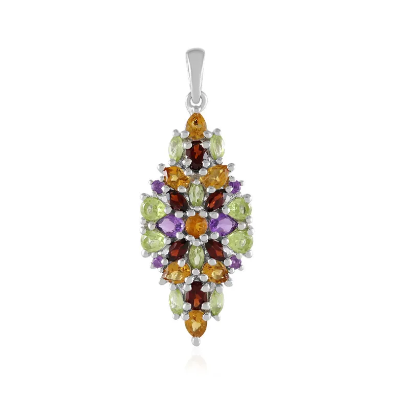 Entdecken Sie diesen exquisiten Anhänger aus Sterlingsilber, der eine lebhafte Sammlung von Edelsteinen präsentiert. Mit Granaten aus Mosambik, chinesischen Peridots, brasilianischen Amethysten und Zitrinen bietet dieses Stück ein Kaleidoskop an Farben und Formen. Es ist perfekt, um jedem Outfit einen Farbtupfer zu verleihen und passt sowohl zu legerer als auch zu formeller Kleidung.