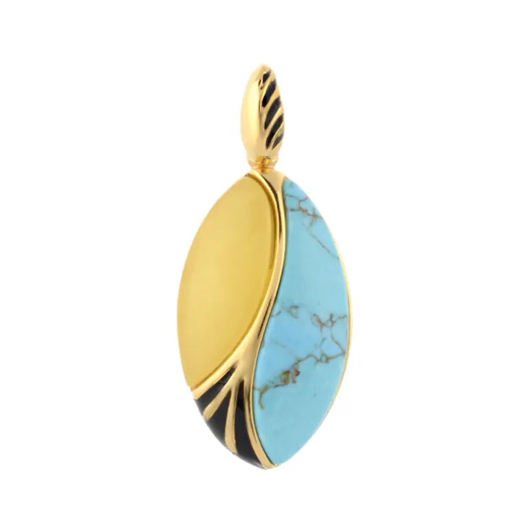 Dieser atemberaubende Anhänger besteht aus einem 2,15-karätigen Türkis aus den USA und einem 1-karätigen baltischen Milchbernstein aus Polen, gefasst in vergoldetem 925er Sterlingsilber. Das elegante Marquise-Cabochon-Design bietet eine einzigartige und fesselnde Mischung aus Farben und Formen. Dieser Anhänger ist perfekt, um jedem Outfit einen Hauch von Eleganz zu verleihen und eignet sich sowohl für legere als auch für formelle Anlässe.