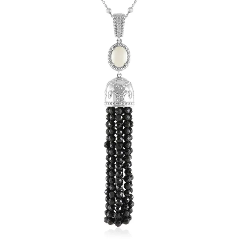 Erhöhen Sie Ihren Stil mit dieser auffälligen Halskette von Dallas Prince Designs. Der ovale Cabochon aus weißem Achat aus China wird durch schillernde Zirkone aus Kambodscha und schwarze Spinellperlen aus Thailand akzentuiert. Diese 45,5-50,5 cm lange Halskette aus 925er Sterlingsilber eignet sich perfekt für die Abendgarderobe und besondere Anlässe und verleiht jedem Outfit einen Hauch von Eleganz.