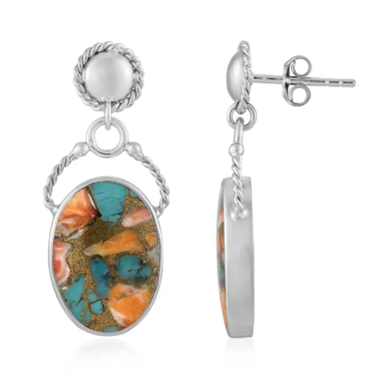 Entdecken Sie die Faszination dieser Kingman Mohave Turquoise Silberohrringe, die ein bezauberndes Mosaik aus blauem Türkis und leuchtend orangefarbener Stachelauster zeigen. Mit einer Größe von 35 mm und ihrem raffinierten Design sind sie sowohl für legere als auch für formelle Anlässe geeignet. Kombinieren Sie sie mit einem fließenden Sommerkleid oder einer schicken Abendgarderobe, um ihre einzigartige Schönheit zu unterstreichen und einen Spritzer Farbe und Eleganz für jeden Anlass zu bieten.