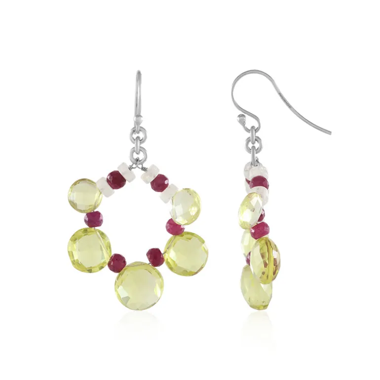 Diese farbenfrohen Ohrringe bestehen aus 12 indischen Rubinen, 8 Regenbogen-Mondsteinen aus Sri Lanka und 10 brasilianischen Kalkquarzsteinen, die alle elegant in 925er Sterlingsilber gefasst sind. Die farbenfrohen Edelsteine mit einem Gesamtgewicht von 44,865 ct bieten einen verspielten und doch raffinierten Charme. Perfekt für die Abendgarderobe oder als Farbtupfer zu einem legeren Outfit. Erhöhen Sie Ihren Stil mit diesem einzigartigen Stück.