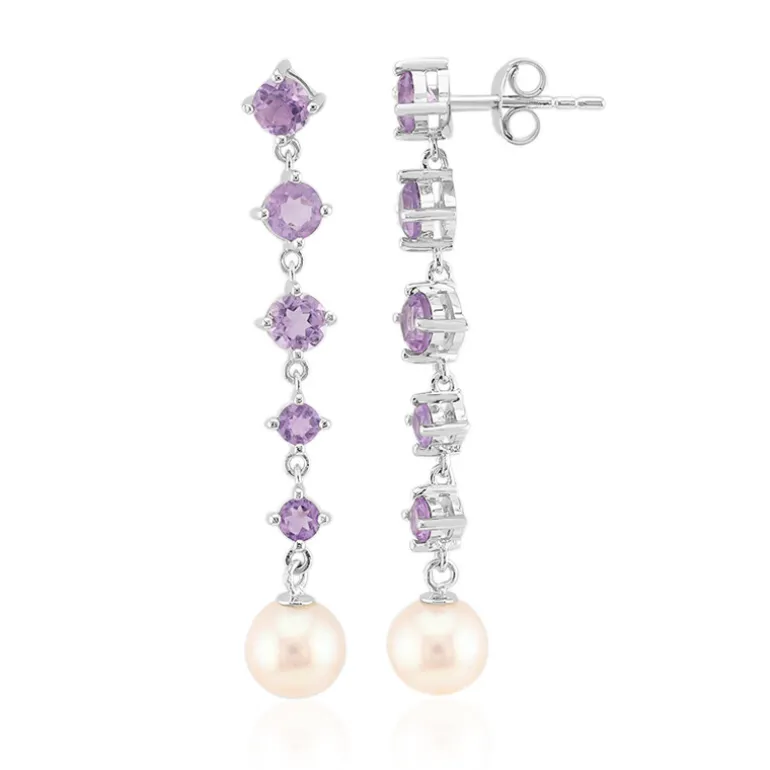 Entdecken Sie die Eleganz dieser Ohrringe aus Sterlingsilber mit strahlend weißen Süßwasserperlen und leuchtenden brasilianischen Amethysten. Das zarte Tropfendesign bietet eine anmutige Bewegung, die sich sowohl für den Alltag als auch für besondere Anlässe eignet. Kombinieren Sie sie mit einem schicken Abendkleid oder einem eleganten Büro-Outfit, um einen Hauch von Raffinesse und Charme zu verleihen.