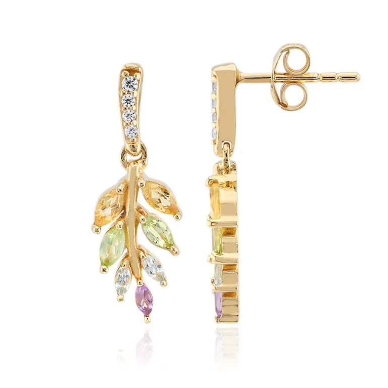Diese farbenfrohen Ohrringe mit brasilianischen Zitrinen, burmesischen Peridots, himmelblauen Topasen, Amethysten und Zirkonen aus Tansania sind ein wahrer Farbrausch. Die Ohrringe aus 925er Sterlingsilber mit luxuriöser Goldplattierung haben ein verspieltes Design im Marquiseschliff. Perfekt, um jedem Outfit einen Hauch von Eleganz zu verleihen, vom legeren Brunch bis zur Abendveranstaltung.
