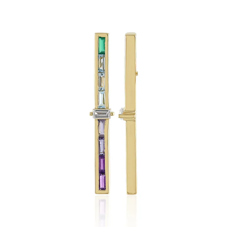 Entdecken Sie die Harmonie der Farben mit diesen Ohrringen aus vergoldetem 925er Sterlingsilber, die eine faszinierende Auswahl an Edelsteinen im Baguetteschliff aufweisen. Grüner Onyx, himmelblauer und weißer Topas, Iolith und Amethyst – alle sorgfältig aus Brasilien, Indien und Sambia bezogen – vereinen sich zu einer 1,82-karätigen Symphonie der Eleganz. Diese 36-mm-Ohrringe sind ideal, um Ihrem Ensemble einen Farbakzent zu verleihen. Sie sind vielseitig genug für den Tag und raffiniert für den Abend.