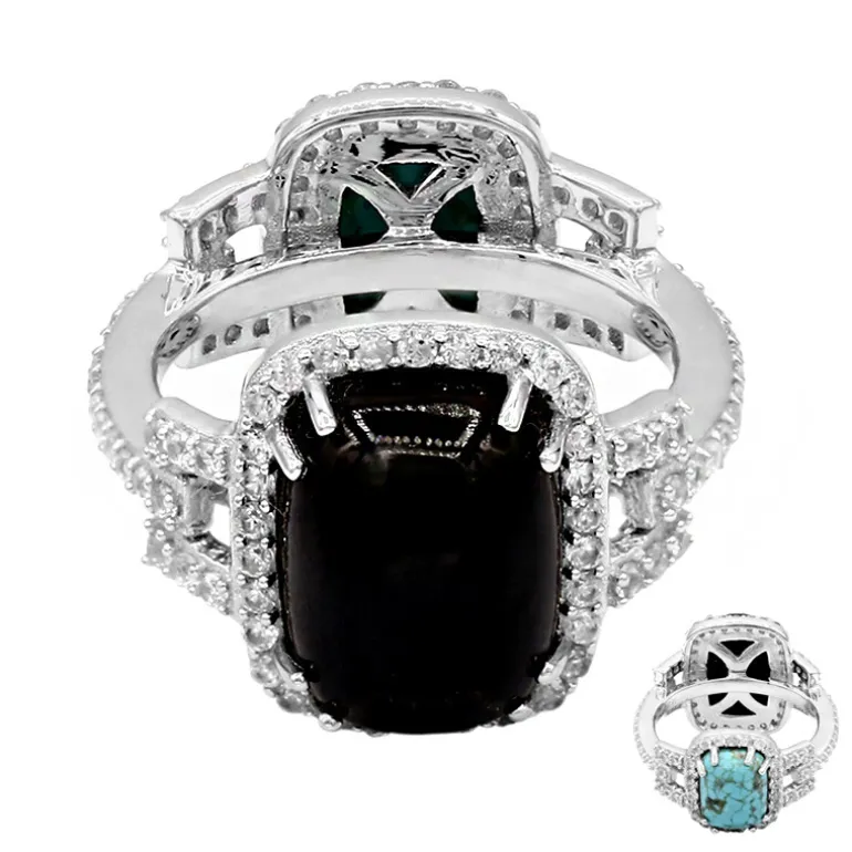 Dieser bezaubernde Ring vereint die dunkle Anziehungskraft eines 6,93 Karat thailändischen Schwarzspinells mit dem lebendigen Touch eines amerikanischen Türkises, insgesamt 9,9 Karat Edelsteingewicht. Der antike Cabochon-Schliff schmückt das 925er Sterling Silberband, während 108 kambodschanische Zirkone den Ring mit ihrem Funkeln umgeben. Perfekt für Abendveranstaltungen oder als raffinierter Begleiter für den Alltag.