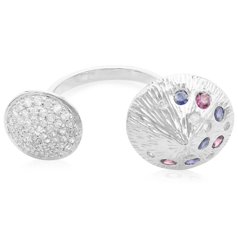 Lassen Sie sich mit diesem atemberaubenden Ring aus Sterlingsilber von dem lebendigen Spektrum der Edelsteine verzaubern. Mit einer Mischung aus azurblauen Saphiren, rosafarbenen Rajasthan-Rhodolithen, geheimnisvollen Mondsteinen und funkelnden Zirkonen trägt dieser Ring insgesamt 1,95 Karat an Edelsteinglück. Der auffällige Formenmix auf einer strukturierten Silberoberfläche macht dieses Schmuckstück perfekt, um Ihrer Alltagskleidung einen Hauch von Eleganz zu verleihen oder Ihre Abendgarderobe lebhaft zu ergänzen. Ganz gleich, ob Sie ein Liebhaber oder ein Neuling in der Welt der Edelsteine sind, dieser Ring wird mit Sicherheit seinen Platz in Ihrer Sammlung finden.