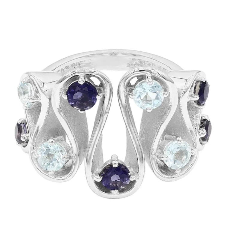 Dieser bezaubernde Ring verbindet die kühle Klarheit des himmelblauen Topas mit dem tiefen Zwielicht des indischen Ioliths. Das Edelstein-Duo von insgesamt 1,96 Karat ist kunstvoll auf einem glänzenden 925er Sterlingsilberband montiert und kreiert einen Tanz aus Licht und Farbe an Ihrem Finger. Das wellenförmige Muster des Rings vermittelt einen fließenden Eindruck und macht ihn zu einem vielseitigen Accessoire, das sich sowohl für einen legeren Brunch als auch für formelle Anlässe eignet. Sein klassisches Design mit einem modernen Twist sorgt dafür, dass er zu einem begehrten Stück in Ihrer Sammlung wird.