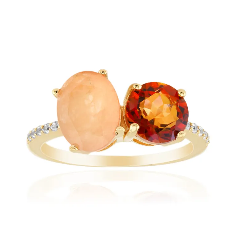 Gönnen Sie sich Eleganz mit diesem atemberaubenden Ring, der einen zarten pfirsichfarbenen Pastellquarz und einen leuchtend orangefarbenen mystischen Quarz enthält, die durch funkelnde Zirkone perfekt ergänzt werden. Der Ring ist aus 925er Sterlingsilber mit einer glänzenden Goldplattierung gefertigt und setzt einen eleganten Akzent. Ideal für die Abendgarderobe oder einen eleganten Tageslook. Kombinieren Sie ihn mit neutralen oder warmen Tönen, um seine leuchtenden Farben zu betonen.