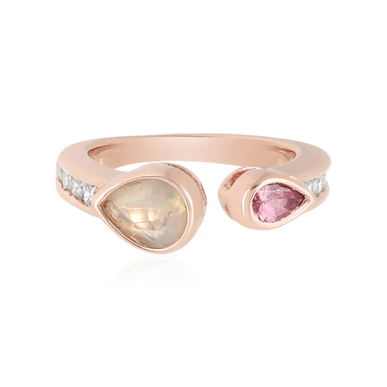 Entdecken Sie das verführerische Rot dieses Rings aus rosévergoldetem 925er Sterlingsilber, der einen bezaubernden äthiopischen Welo-Opal mit einem leuchtend rosafarbenen Turmalin aus Nigeria vereint, beide im perfekten Tropfenschliff. Das Schmuckstück ist mit neun kambodschanischen Zirkonen im Rundschliff verziert, die ihm einen zusätzlichen Glanz verleihen. Dieses Design mit zwei Steinen verkörpert moderne Romantik und eignet sich für den eleganten Alltag oder als subtiles Statement für besondere Anlässe. Das Gesamtgewicht des Edelsteins beträgt 0,927 Karat, was ihn ebenso kostbar wie anmutig macht.