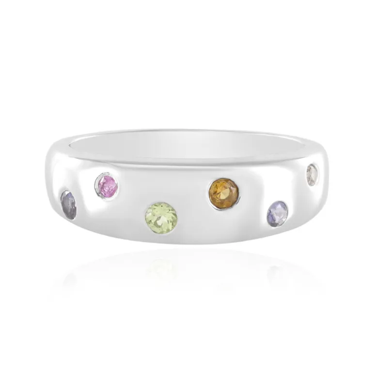Entdecken Sie einen Regenbogen an Ihrem Finger mit diesem farbenfrohen Edelsteinring. Das mit Präzision gefertigte Band aus Sterlingsilber, das mit hochwertigem Platin überzogen ist, enthält eine spektakuläre Kollektion rund geschliffener Edelsteine, darunter die satten Blautöne des Ioliths aus Madagaskar, die satten Grüntöne des Peridots aus China, die warmen Goldtöne des Zitrins aus Brasilien und das zartrosa Funkeln der Saphire aus Thailand, ergänzt durch die Brillanz der Zirkone aus Kambodscha mit insgesamt 0,162 Karat. Das schlanke Design von 20×19 mm strahlt einen modernen Charme aus, der sich für den Alltag und besondere Anlässe eignet. Kombinieren Sie ihn mit Ihren Lieblingsoutfits, um einen Hauch von Raffinesse und Farbe hinzuzufügen.