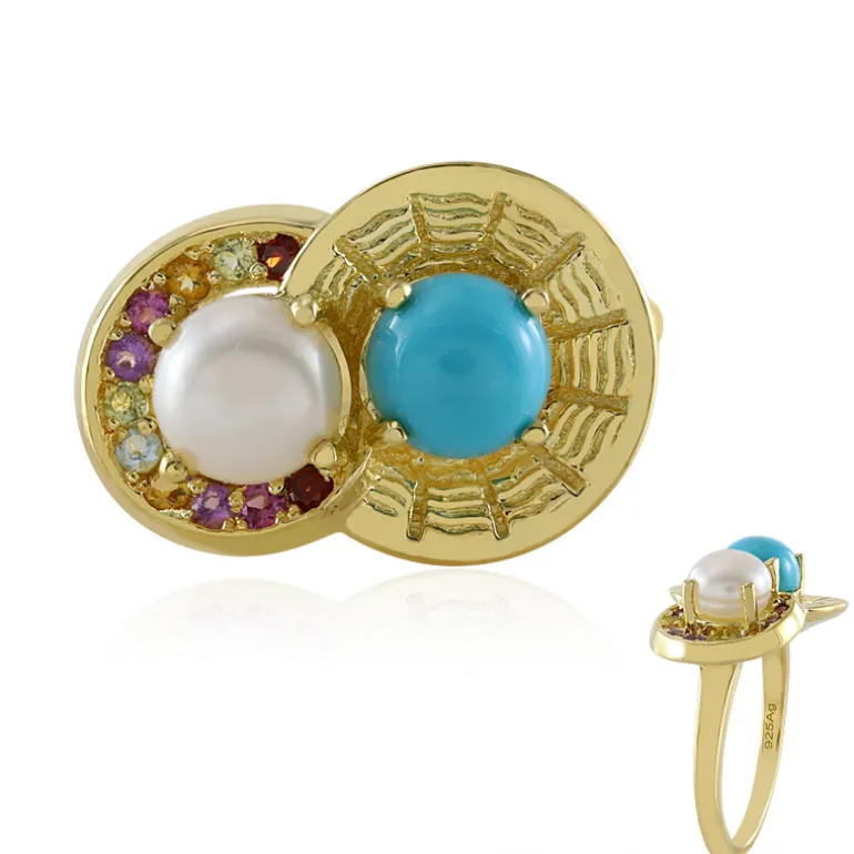 Dieser bezaubernde Ring zeigt einen bezaubernden Dornröschen-Türkis aus den USA, gepaart mit einer leuchtend weißen Süßwasser-Zuchtperle aus China. Akzentuiert durch exquisite Peridote, Granate und Amethyste, strahlt dieses vergoldete Stück aus 925er Sterlingsilber Raffinesse aus. Es eignet sich sowohl für legere Anlässe als auch für schicke Abendveranstaltungen und verleiht jedem Ensemble einen Hauch von Eleganz.