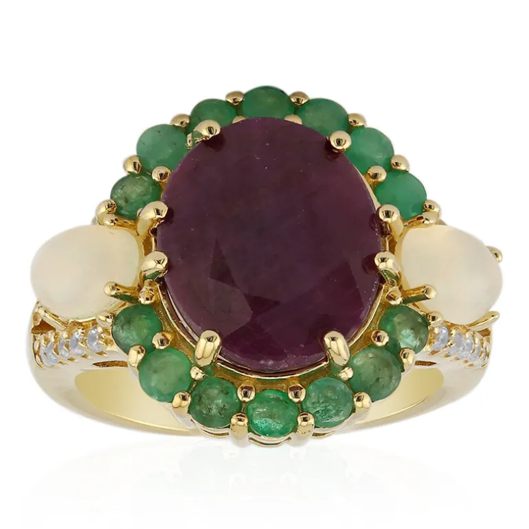 Entdecken Sie die Anziehungskraft unseres ovalen Rings mit indischem Rubin und Smaragd, dessen Herzstück ein 5,366 Karat schwerer indischer Rubin ist, der von glänzenden brasilianischen Smaragden und Welo-Opalen aus Äthiopien umgeben ist. Dieses exquisite Stück ist kunstvoll aus 925er Sterlingsilber gefertigt und mit einer leuchtenden Goldplattierung verziert. Es wiegt ca. 4,44 g. Funkelnde Zirkon-Akzente aus Tansania verleihen ihm einen Hauch von Glamour und machen ihn perfekt für elegante Abende oder als gewagtes Statement bei besonderen Veranstaltungen.