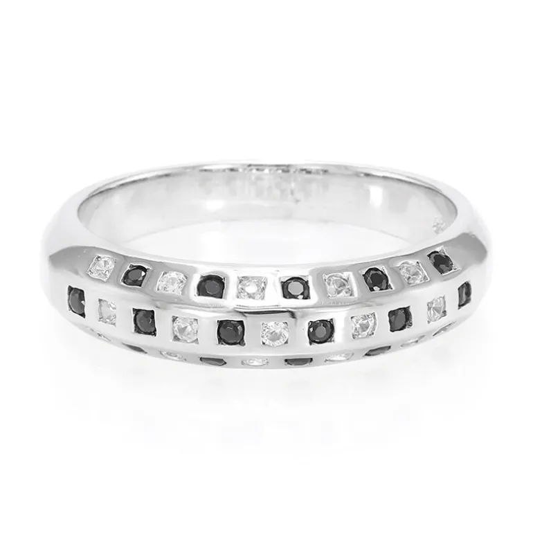 Dieser auffällige Ring vereint die Anziehungskraft von 16 schwarzen Spinellen im Brillantschliff mit dem Funkeln von 15 Zirkonen von insgesamt 0,585 Karat. Das moderne Design aus hochwertigem 925er Sterlingsilber umschließt Ihren Finger mit einer monochromen Eleganz, die sich vielseitig für den Übergang von Tag zu Abend eignet. Er ist ideal, um jedem Outfit einen raffinierten Touch zu verleihen, und ist sowohl ein gewagtes Statement-Stück als auch eine zeitlose Ergänzung Ihrer Schmucksammlung.