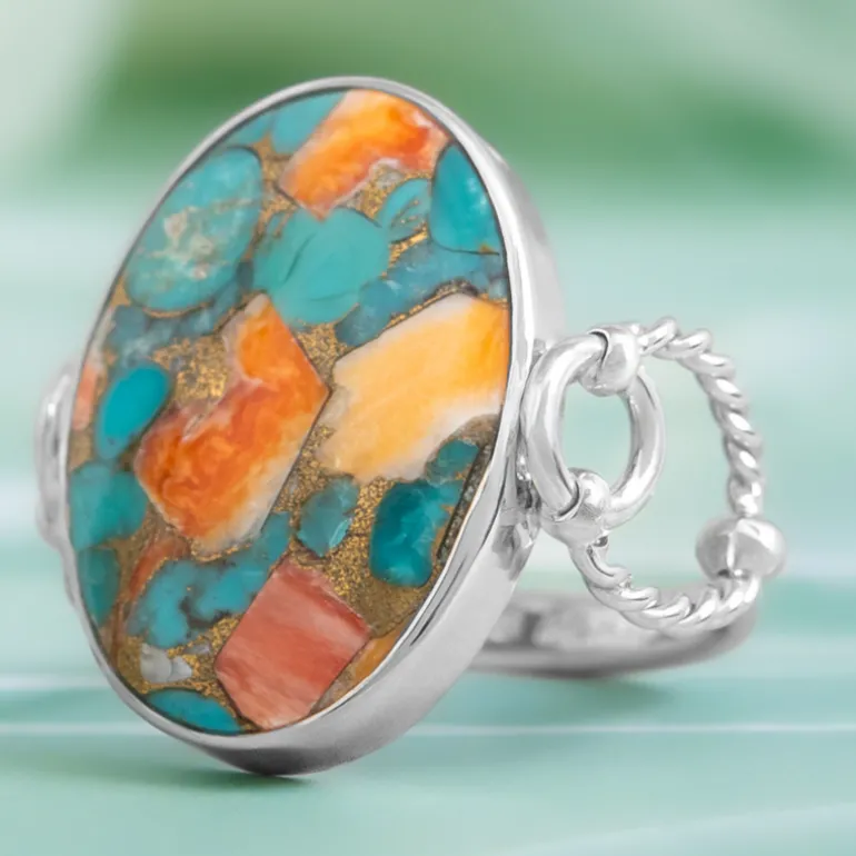 Dieser atemberaubende Silberring zeigt ein faszinierendes Mosaik aus blauem Kingman-Mohave-Türkis und leuchtend orangefarbener Stachelauster. Die Verschmelzung dieser Farben schafft ein einzigartiges und auffälliges Design, perfekt für alle, die auffällige Accessoires lieben. Er eignet sich sowohl für legere als auch für formelle Anlässe und kann mit einem schlichten Outfit kombiniert werden, um den Ring in den Mittelpunkt zu stellen. Ein Muss für alle Schmuckliebhaber, die auf der Suche nach einem unverwechselbaren Schmuckstück sind.