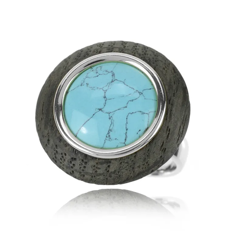 Entdecken Sie die erdige Anziehungskraft dieses einzigartigen Rings mit einem beeindruckenden 6,4-karätigen Türkiscabochon aus den USA, der vor dem faszinierenden Hintergrund polnischer Mooreiche eingefasst ist. Die wunderschön kontrastierenden Materialien sind elegant in hochwertiges 925er Sterlingsilber eingefasst. Perfekt, um Ihrem Outfit einen Hauch von naturinspirierter Raffinesse zu verleihen, egal ob Sie sich für eine Vernissage herausputzen oder sich für ein Brunch-Date ausstaffieren.