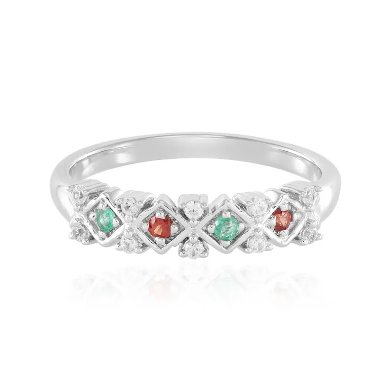 Dieses atemberaubende Schmuckstück bietet eine Sinfonie des Funkelns mit zwei lebhaften russischen Smaragden und zwei reichen tansanischen Rubinen, die jeweils sorgfältig auf 2 mm geschliffen und von einer Reihe funkelnder kambodschanischer Zirkone umrahmt sind. Dieser Ring ist in platiniertem 925er Sterlingsilber gefasst, das für zusätzliche Brillanz sorgt, und zeugt von feiner Handwerkskunst und Stil. Perfekt für einen eleganten Abend oder als Geschenk für einen besonderen Menschen.
