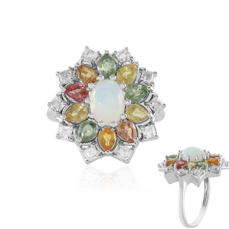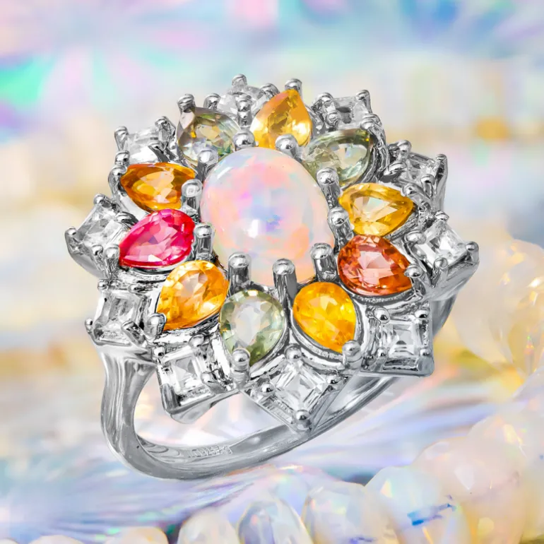 Erleben Sie die bezaubernde Schönheit eines äthiopischen Welo-Opals, elegant eingefasst in einen Heiligenschein aus 10 lebhaften Madagaskar-Saphiren und 10 funkelnden brasilianischen Topasen. Dieser Ring aus Sterlingsilber, platiniert für ein luxuriöses Finish, bietet eine harmonische Mischung aus Opulenz und modernem Stil. Perfekt für besondere Anlässe oder als glamouröser Begleiter für den Alltag.