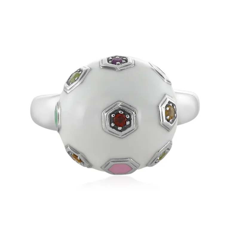Entdecken Sie mit diesem Ring aus platiniertem 925er Sterling Silber der MONOSONO COLLECTION eine Schatztruhe voller Farben und Charme. Geschmückt mit einem lebhaften Mosaik aus brasilianischem Amethyst, indischem Granat, chinesischen Peridots und Zitrinen, ist jeder Edelstein sorgfältig rund geschliffen mit 0,016 ct für das perfekte Funkeln. Mit einem Gewicht von ca. 6,58 g und einem einzigartigen Design, das die Edelsteine in komplizierte Muster einfügt, ist dieses Schmuckstück ein Blickfang auf jeder Veranstaltung. Ideal, um einem monochromen Outfit einen Farbtupfer zu verleihen oder als Mittelpunkt eines festlichen Ensembles.