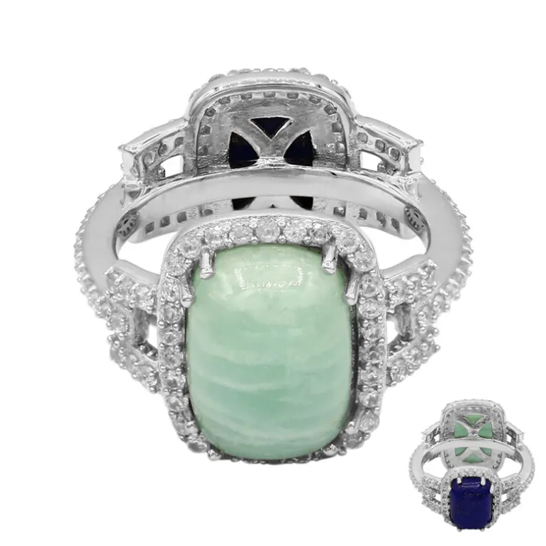 Entdecken Sie den Zauber der Edelsteinverschmelzung mit unserem Ring aus Sterlingsilber, der einen ruhigen brasilianischen Amazonit-Cabochon von 4,685 Karat und einen lebhaften Lapislazuli von 2,205 Karat aus Afghanistan enthält. Umgeben von 108 funkelnden kambodschanischen Zirkonen mit einem Gesamtgewicht von 1,35 ct. wiegt dieses exquisite Stück 5,43 g und misst 31 x 20 mm. Dieser Ring eignet sich perfekt für die Abendgarderobe oder als Farbakzent für den Alltag und zeugt von zeitloser Eleganz und weltlichem Charme.
