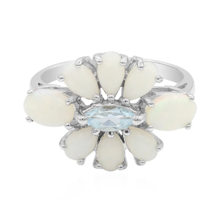 Tauchen Sie ein in die schillernde Anziehungskraft dieses Rings aus Sterlingsilber mit einer Symphonie aus australischen weißen Opalen, flankiert von einem himmelblauen Topas im Marquiseschliff aus Brasilien. Mit einem Gesamtgewicht von 1,503 Karat vereint dieses Schmuckstück das einzigartige Farbspiel der Opale mit der ruhigen Klarheit des Topas. Die elegante Fassung aus 925er Sterlingsilber ergänzt den kühlen Glanz und macht ihn zu einem auffälligen Accessoire. Dieser Ring ist ideal, um Ihrem Outfit einen Hauch von Eleganz zu verleihen, und eignet sich sowohl für den täglichen Gebrauch als auch für besondere Anlässe.