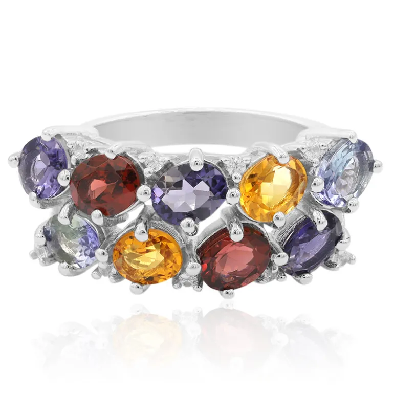 Dieser leuchtende Ring aus Sterlingsilber verströmt Raffinesse mit einer lebhaften Ansammlung von Edelsteinen, darunter ein indischer Iolith, ein brasilianischer Citrin, ein Granat aus Mosambik und ein Tansanit aus Tansania, die alle makellos in ovale Formen geschliffen sind, um maximal zu funkeln. Das bezaubernde Farbenspiel wird durch den zarten Schimmer kambodschanischer Zirkone akzentuiert und macht den Anhänger zu einem fesselnden Accessoire für jede gesellschaftliche Veranstaltung oder Feier. Mit einem Gesamtgewicht von 2,743 Karat kann dieser Ring sowohl im Alltag als auch bei besonderen Anlässen einen Hauch von Eleganz vermitteln.